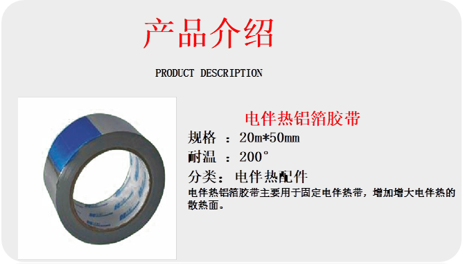 - 鋁箔膠帶:增強伴熱帶與管道熱傳導,同時輔助固定,寬度常用25/50mm,耐溫≥100℃。